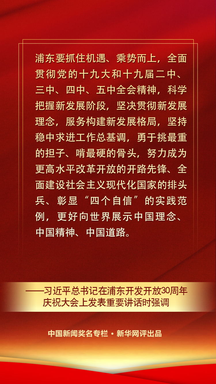 新區(qū)三十正青春,浦東更向潮頭立。堅(jiān)持“吃改革飯、走開放路、打創(chuàng)新牌”,勇當(dāng)標(biāo)桿、敢為闖將,浦東必將奮力創(chuàng)造新時(shí)代新奇跡,為實(shí)現(xiàn)“兩個(gè)一百年”奮斗目標(biāo)和中華民族偉大復(fù)興的中國夢貢獻(xiàn)更大力量。(文字:馬若虎 海報(bào):程媛媛)