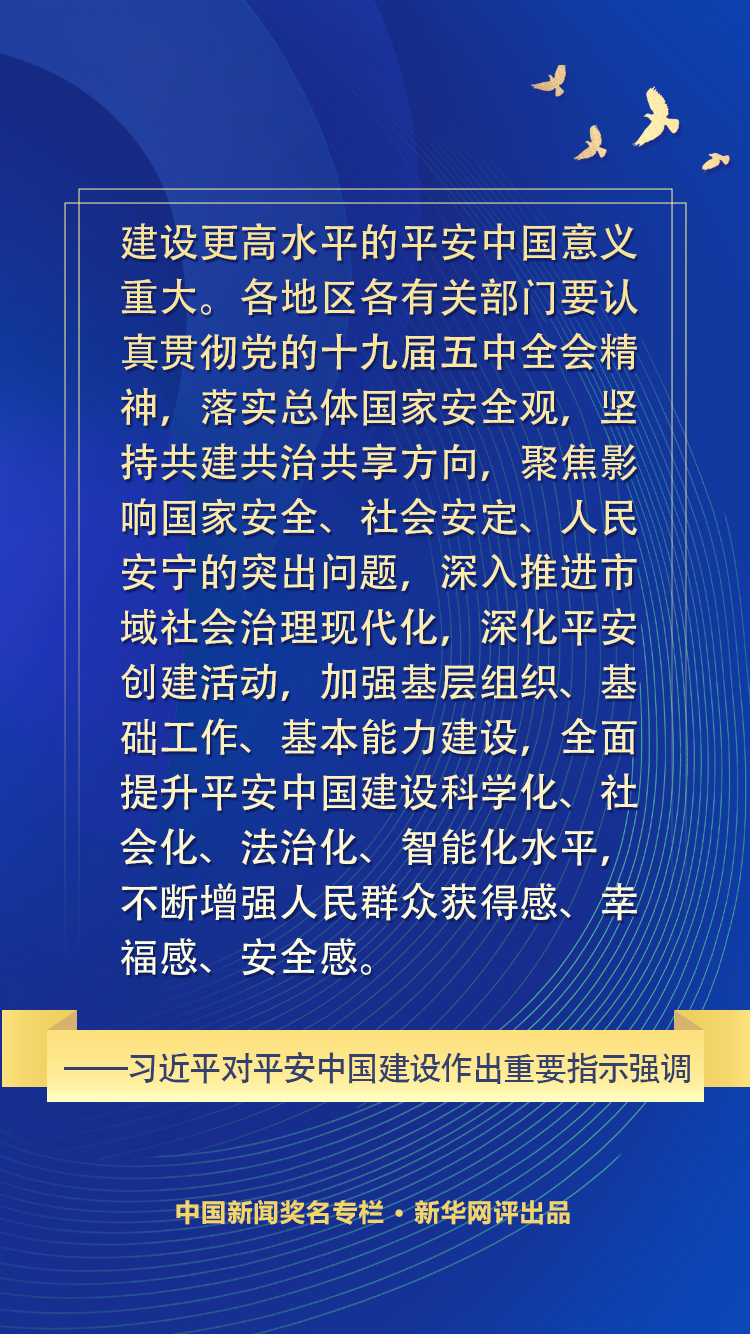“建設(shè)更高水平的平安中國(guó)意義重大!苯,習(xí)近平總書記對(duì)平安中國(guó)建設(shè)作出重要指示,肯定各地區(qū)各有關(guān)部門開展平安中國(guó)建設(shè)取得的成效,對(duì)建設(shè)更高水平的平安中國(guó)作出部署要求。