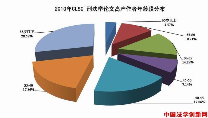 第三,35歲以下作者異軍突起,成為刑法學(xué)研究的生力軍。該年齡段2010年度高產(chǎn)作者包括杜宇、車(chē)浩、姜濤、王鋼、蔡桂生、陳偉、李翔、蔣娜,多達(dá)8人,占總?cè)藬?shù)28人的28.6%。由此足以說(shuō)明,刑法學(xué)青年才俊倍出,學(xué)科發(fā)展后勁十足。