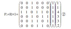 在這里,從第1行到第6行,分別排列著論題甲到論題乙的連線信息。(44)由于這是個無向圖,即使行與列進(jìn)行替換仍然構(gòu)成同一行列。如果兩個論題相連,則對應(yīng)元素為1,例如甲與丙是相連的,矩陣R的1行3列的元素r13是1,3行1列的元素r31也是1。如果論題不相連則為0。如果處于同一行和列,那就成為自己與自己相連,但這樣不能構(gòu)成對話,所以也設(shè)定為0。對各個論題的連線次數(shù),可以用矩陣R乘以元素全為1的列向量進(jìn)行計(jì)算。這個計(jì)算的結(jié)果以列向量P[,1]來表示如下: