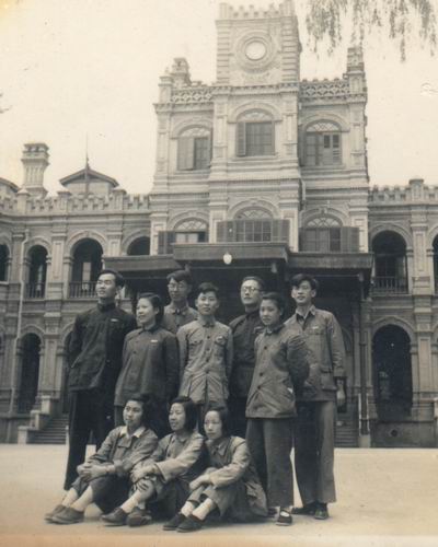 【1950-1951年法律系第一屆研究生法理組在鐵一號主樓前照的,前排自左向右:張夢梅、方真(已故)、謝會皋;二排,自左至右:張云秀、馮景遠(yuǎn)(已故)、胡瑾;三排,自左至右:齊迺寬(已故)、孫國華、潘靜成(已故)、張懋!
