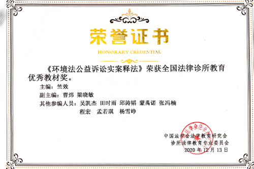 環(huán)境法實案釋法系列案例教材還曾多次應用于審判人員和環(huán)保公益培訓。該系列教材所提應用對策也曾被有關法院審理疑難案件所借鑒。2018年首部出版的《環(huán)境公益訴訟實案釋法》還曾獲得“全國法律診所教育優(yōu)秀教材獎”。
