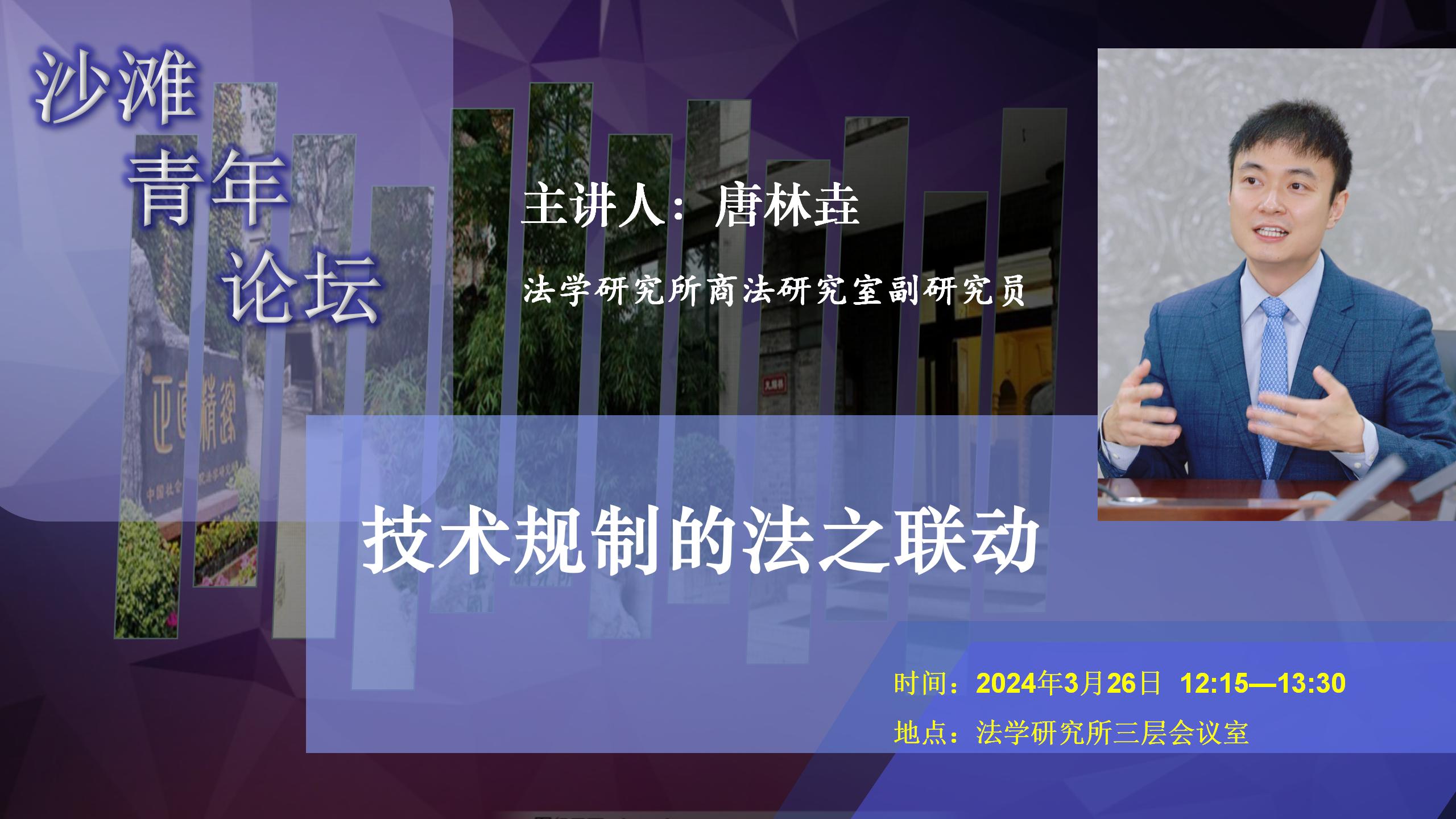 3月26日,由中國社會科學院法學研究所、國際法研究所主辦的2024年沙灘青年論壇“法治與中國式現(xiàn)代化”系列講座第三場在京舉行,法學研究所商法室副研究員唐林垚以“技術(shù)規(guī)制的法之聯(lián)動”為題作學術(shù)報告。