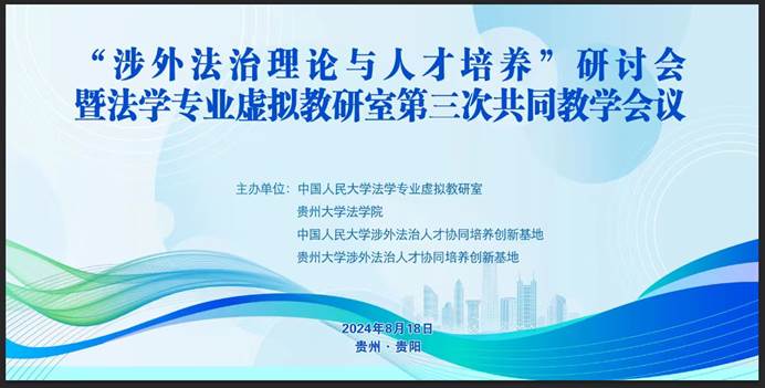 2024年8月17-18日,由中國(guó)人民大學(xué)法學(xué)專業(yè)虛擬教研室、貴州大學(xué)法學(xué)院、中國(guó)人民大學(xué)涉外法治人才協(xié)同培養(yǎng)創(chuàng)新基地、貴州大學(xué)涉外法治人才協(xié)同培養(yǎng)創(chuàng)新基地主辦的“涉外法治理論與人才培養(yǎng)”研討會(huì)暨法學(xué)專業(yè)虛擬教研室第三次共同教學(xué)會(huì)議在貴陽(yáng)成功舉行。來(lái)自中國(guó)人民大學(xué)、貴州大學(xué)、清華大學(xué)、中國(guó)政法大學(xué)、武漢大學(xué)、中南財(cái)經(jīng)政法大學(xué)、對(duì)外經(jīng)濟(jì)貿(mào)易大學(xué)、華東政法大學(xué)、暨南大學(xué)、廣東省社會(huì)科學(xué)院、中國(guó)國(guó)際經(jīng)濟(jì)貿(mào)易仲裁委員會(huì)、金誠(chéng)同達(dá)律師事務(wù)所、德衡律師事務(wù)所、北京盈科律師事務(wù)所等高校、科研機(jī)構(gòu)、律師事務(wù)所的四十余名專家學(xué)者出席會(huì)議。