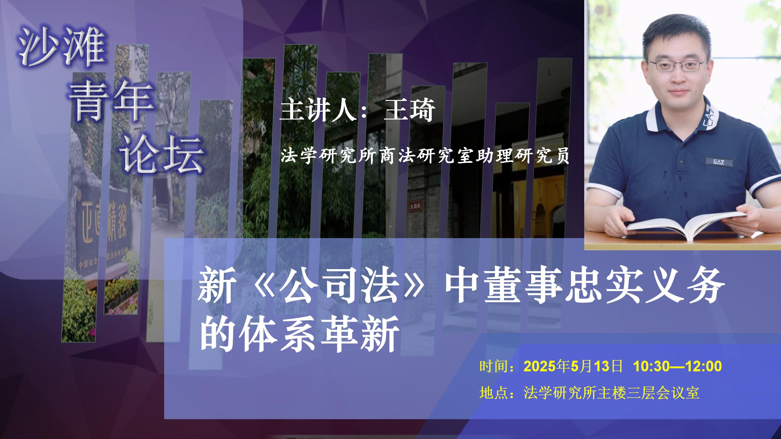 5月13日,由中國(guó)社會(huì)科學(xué)院法學(xué)研究所、國(guó)際法研究所主辦的2025年沙灘青年論壇“法治與中國(guó)式現(xiàn)代化”系列講座第三講在京舉行。法學(xué)研究所商法研究室王琦助理研究員以“新《公司法》中董事忠實(shí)義務(wù)的體系革新”為主題作學(xué)術(shù)報(bào)告,法學(xué)研究所科研處處長(zhǎng)張錦貴主持講座。