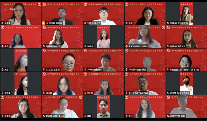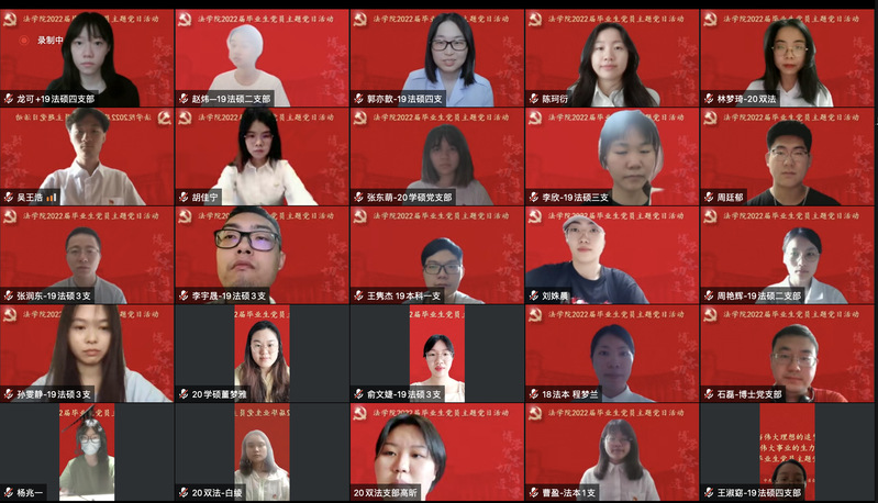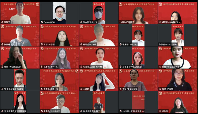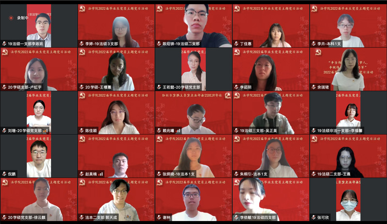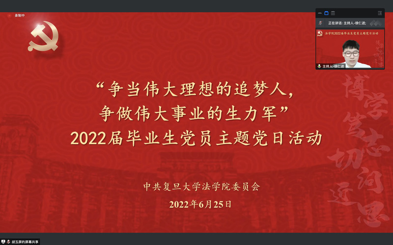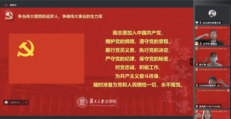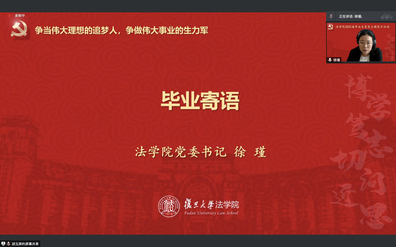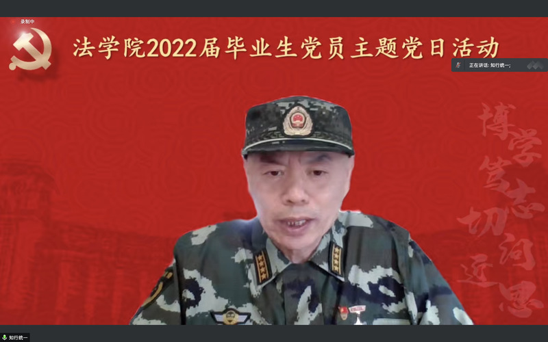 為賡續(xù)紅色血脈,傳承復(fù)旦精神,扎實(shí)過(guò)好畢業(yè)生黨員在學(xué)校期間的最后一次組織生活,引導(dǎo)畢業(yè)生黨員爭(zhēng)做堪當(dāng)民族復(fù)興重任的時(shí)代新人,法學(xué)院于2022年6月25日上午舉行2022屆畢業(yè)生黨員主題黨日活動(dòng)。學(xué)院黨委書記徐瑾、黨委副書記鐘妮、原云南省武警總隊(duì)政治部主任徐魯海大校和全體畢業(yè)生黨員共計(jì)184人通過(guò)騰訊會(huì)議線上參加活動(dòng)。