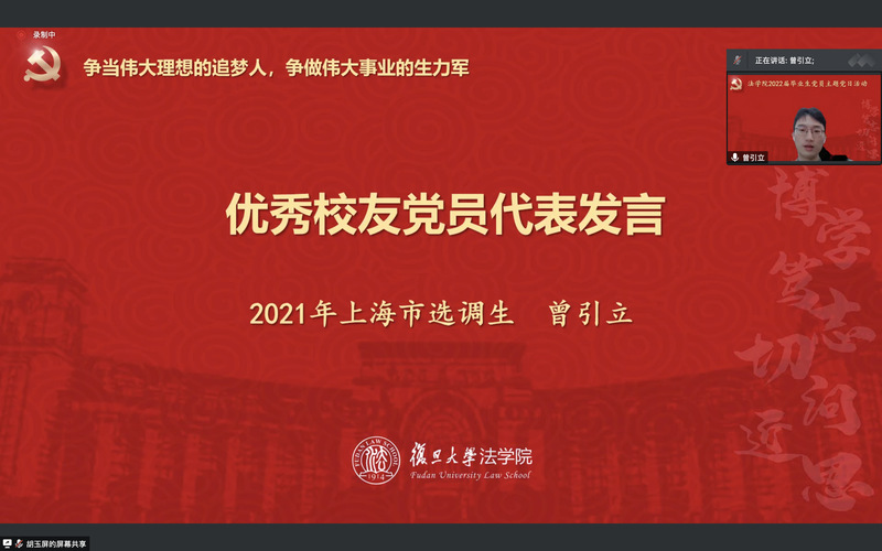 隨后,法學(xué)院優(yōu)秀校友黨員代表分享青年黨員如何在工作崗位中展現(xiàn)責(zé)任擔(dān)當(dāng)、彰顯黨員身份。2021屆憲法學(xué)與行政法學(xué)碩士畢業(yè)生、上海市選調(diào)生曾引立介紹了自己的基層駐村經(jīng)歷,講述了上?挂咭痪緊鑼密鼓的核酸篩查、物資發(fā)放的工作情況,表示自己作為一名普通的黨員干部,通過(guò)投身基層抗疫工作,對(duì)為人民服務(wù)的黨的宗旨有了更深刻的認(rèn)識(shí)。2021屆訴訟法學(xué)碩士畢業(yè)生、中央選調(diào)生葉夏銘分享了自己從一名學(xué)生黨員步入公務(wù)員崗位的心路歷程,圍繞把黨員身份放在第一位、保持學(xué)習(xí)、擺正心態(tài)三個(gè)方面,講述了自己在畢業(yè)后的實(shí)際工作中,堅(jiān)定“功成不必在我、功成必定有我”思想自覺(jué)的過(guò)程。