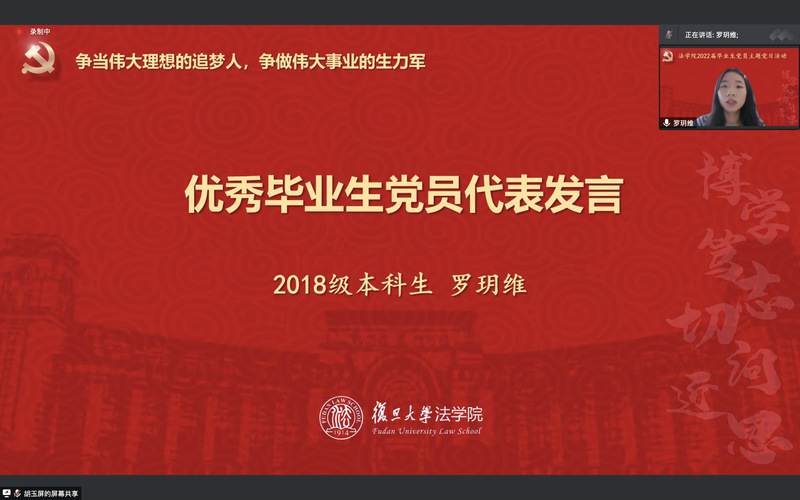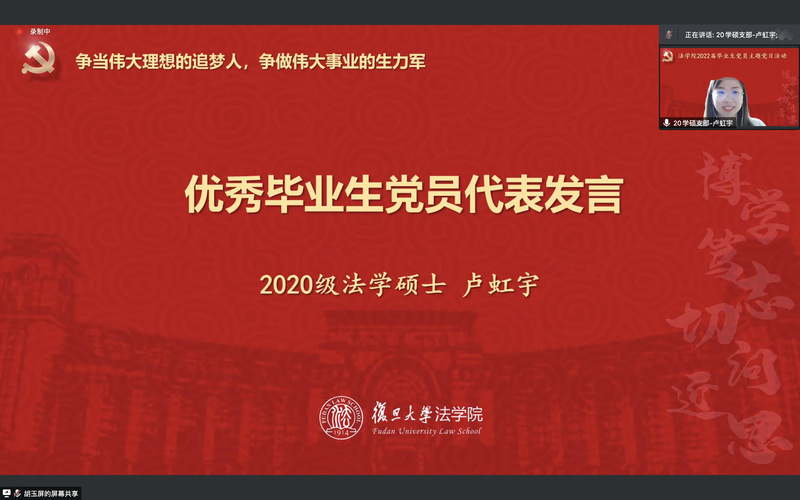 三名優(yōu)秀畢業(yè)生黨員結(jié)合在學(xué)校期間的學(xué)習(xí)和收獲發(fā)表畢業(yè)感言。2022屆法學(xué)本科畢業(yè)生羅玥維從自己與憲法學(xué)的緣分和認(rèn)識(shí)出發(fā),探討了學(xué)生黨員如何在學(xué)術(shù)追求道路上發(fā)揮先鋒模范作用。2022屆憲法學(xué)與行政法學(xué)碩士畢業(yè)生盧虹宇結(jié)合自己在復(fù)旦本研7年的成長(zhǎng)經(jīng)歷和疫情期間校園志愿服務(wù)經(jīng)歷,闡述了對(duì)黨員責(zé)任意識(shí)和使命擔(dān)當(dāng)?shù)睦斫狻?022屆法律(非法學(xué))碩士畢業(yè)生趙蕾則分享了個(gè)人成長(zhǎng)經(jīng)歷與心得,并表示今后將繼續(xù)矢志拼搏,爭(zhēng)當(dāng)偉大理想的追夢(mèng)人,爭(zhēng)做偉大事業(yè)的生力軍。