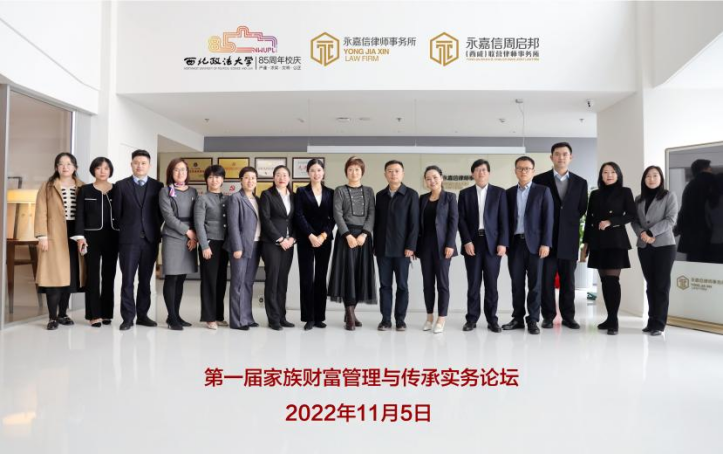 2022年11月5日,西北政法大學八十五周年校慶系列活動之第一屆“家族財富管理與傳承實務論壇”在陜西永嘉信律師事務所舉辦。論壇圍繞家族財富管理、家族企業(yè)治理、家族信托中的實務與理論問題展開研討。此次論壇由西北政法大學家族財富管理與傳承研究中心主辦,西北政法大學民商法學院承辦,陜西永嘉信律師事務所協(xié)辦,采取線上與線下相結合的方式,分為主旨發(fā)言、會議研討和自由研討。