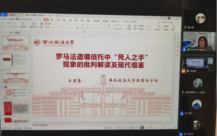 第一位主旨發(fā)言人是西北政法大學發(fā)展規(guī)劃與學科建設處處長王瑩瑩教授,王瑩瑩教授以“羅馬法遺囑信托中‘死人之手’現(xiàn)象的批判解讀及現(xiàn)代借鑒”為主題,從羅馬法遺囑信托中遺囑人遺產(chǎn)控制力的延伸狀態(tài)、近代民法典中遺囑人遺產(chǎn)控制力的延伸狀態(tài)、遺囑人遺產(chǎn)控制力延伸的必然性、法律對遺囑人遺產(chǎn)控制力延伸進行干預的合理性、“死人之手”現(xiàn)象在羅馬法遺囑信托與近代民法信托替補中的比較、我國民法典的遺囑信托制度六個方面,向我們展示了羅馬法遺囑信托中值得借鑒之處。她同時提出了一個值得研究的問題:在遺囑信托中,如何讓立遺囑人的意志既得到延續(xù),又得到相應的合理限制。