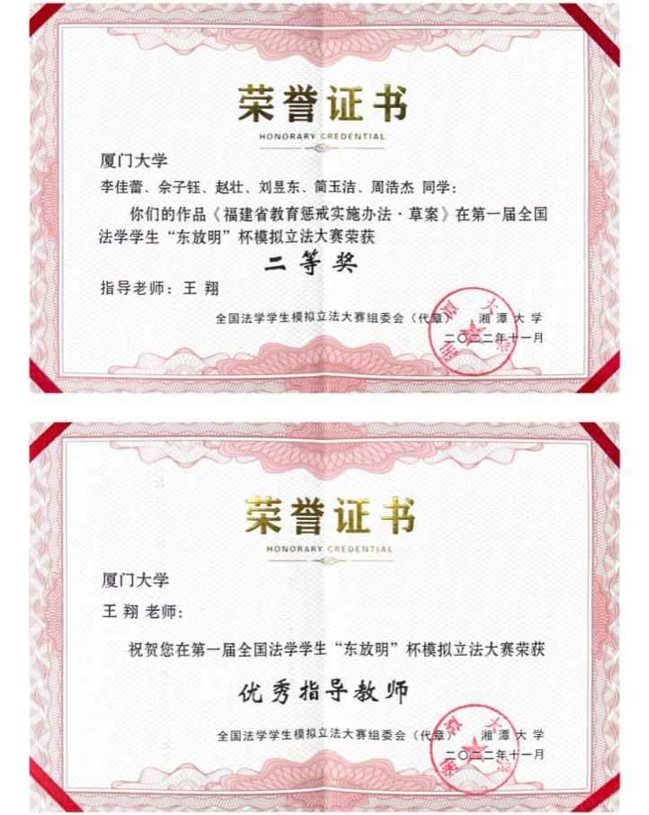 廈門大學(xué)代表隊(duì)的參賽作品《福建省教育懲戒實(shí)施辦法·草案》榮獲大賽二等獎(jiǎng),指導(dǎo)老師王翔助理教授榮獲“優(yōu)秀指導(dǎo)教師”的稱號(hào)。本次參賽作品是法學(xué)院本研合作的成果,本科生李佳蕾同學(xué)擔(dān)任團(tuán)隊(duì)主持人,團(tuán)隊(duì)成員包括碩士生佘子鈺、趙壯、劉昱東、簡(jiǎn)玉潔、周浩杰等同學(xué)。在王翔老師的指導(dǎo)下,廈門大學(xué)代表隊(duì)六名成員多次研討充分備賽,順利通過(guò)初賽、復(fù)賽,并在最后的答辯階段展現(xiàn)出強(qiáng)勁的實(shí)力和卓越的風(fēng)采,獲得評(píng)審專家的一致認(rèn)可。