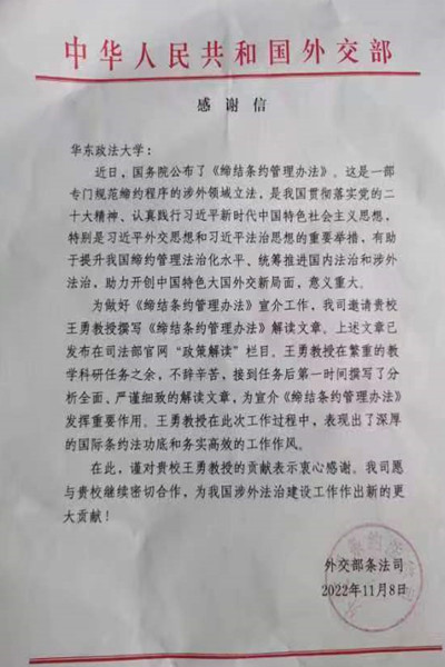王勇在此次工作過程中,表現(xiàn)出了深厚的國(guó)際條約法功底和務(wù)實(shí)高效的工作作風(fēng),為我國(guó)涉外法治建設(shè)工作作出了貢獻(xiàn),因此外交部法條司特發(fā)感謝信表示感謝。