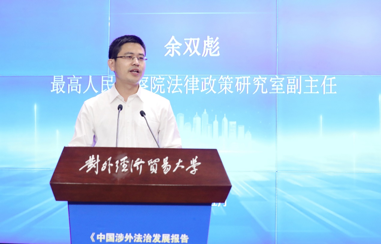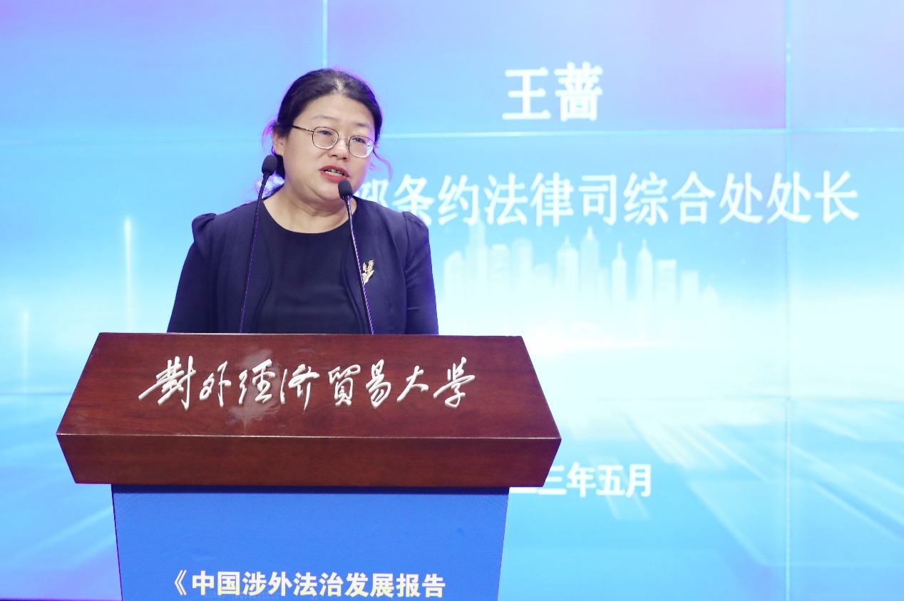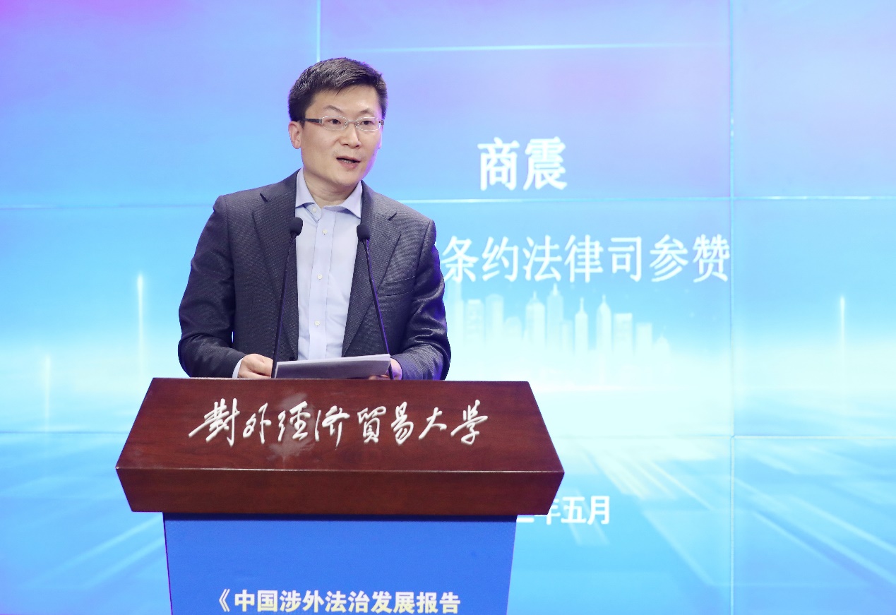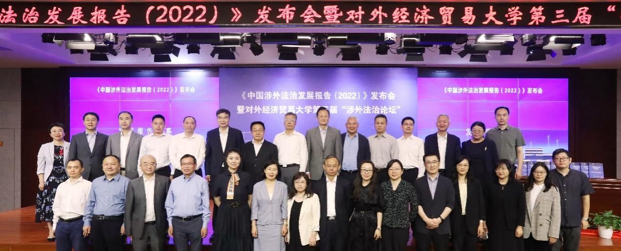 2023年5月28日,對(duì)外經(jīng)濟(jì)貿(mào)易大學(xué)涉外法治研究院和法學(xué)院共同舉辦的《中國涉外法治發(fā)展報(bào)告(2022)》發(fā)布會(huì)暨對(duì)外經(jīng)濟(jì)貿(mào)易大學(xué)第三屆“涉外法治論壇”在學(xué)校國際交流大廈報(bào)告廳舉行。司法部黨組成員、副部長(zhǎng)王振江,中國法學(xué)會(huì)黨組成員、副會(huì)長(zhǎng)兼秘書長(zhǎng)張鳴起,教育部政策法規(guī)司司長(zhǎng)鄧傳淮,最高人民法院民事審判第四庭副庭長(zhǎng)張樹明,最高人民檢察院法律政策研究室副主任余雙彪,司法部法治調(diào)研局副局長(zhǎng)姜海濤,外交部條約法律司參贊商震,教育部政策法規(guī)司處長(zhǎng)翟剛學(xué),商務(wù)部條法司綜合處處長(zhǎng)王薔,人民檢察雜志社社長(zhǎng)莊永廉,國際商會(huì)“一帶一路”委員會(huì)主席、中國鹽業(yè)集團(tuán)總經(jīng)理于騰群,武漢大學(xué)國際法治研究院院長(zhǎng)、國際法研究所所長(zhǎng)肖永平教授,中國國際經(jīng)濟(jì)貿(mào)易仲裁委員會(huì)仲裁院副院長(zhǎng)谷巖等200余位來自政府部門、實(shí)務(wù)機(jī)構(gòu)和校內(nèi)外專家學(xué)者代表,以及對(duì)外經(jīng)濟(jì)貿(mào)易大學(xué)黨委書記黃寶印、校長(zhǎng)趙忠秀、副校長(zhǎng)王強(qiáng)、王敬波共同出席本次發(fā)布會(huì)。