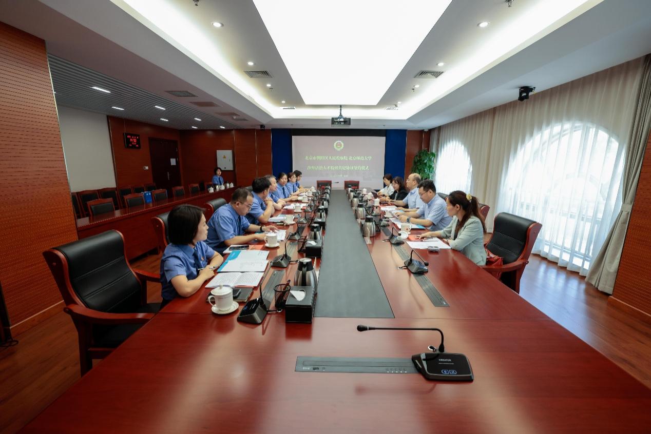 會(huì)上,馬天博檢察長詳細(xì)介紹了朝陽區(qū)檢察院的亮點(diǎn)工作、隊(duì)伍建設(shè)和干警培養(yǎng)等相關(guān)情況;梁迎修院長對(duì)法學(xué)院的發(fā)展情況、教學(xué)情況及學(xué)科建設(shè)情況等方面進(jìn)行介紹;胡靜副檢察長與梁迎修院長作為雙方代表簽署了涉外法治人才檢校共建協(xié)議。"朝檢·涉外博匯學(xué)堂"開班儀式上,朝陽檢察院政治部宣教組組長、涉外檢察辦公室主任張力介紹"涉外博匯學(xué)堂"相關(guān)情況,帶教檢察官莊小茜作代表發(fā)言。
