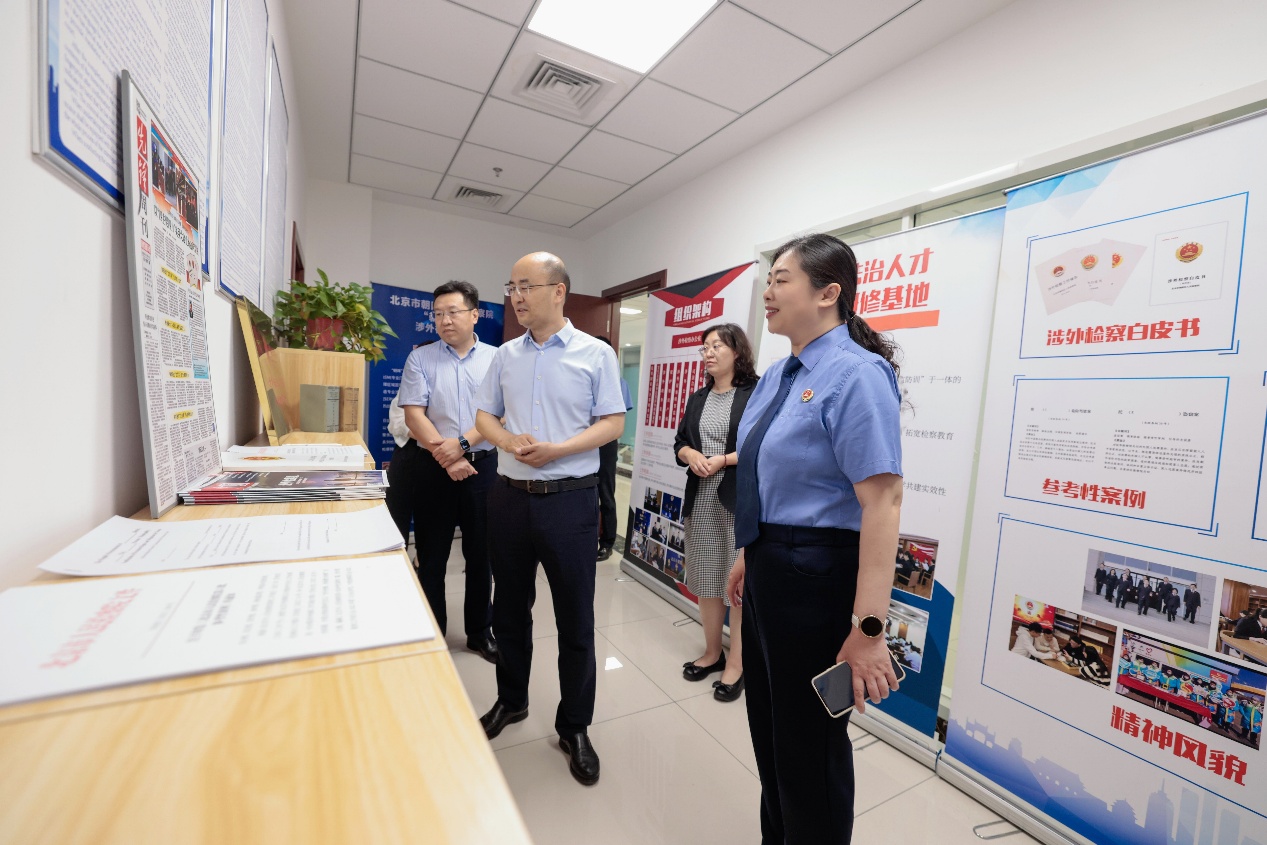 會(huì)前,梁迎修院長一行先后參觀了朝陽檢察院涉外案件遠(yuǎn)程提訊室、涉外案件聽證室、涉外案件遠(yuǎn)程工作室、律師接待中心、涉外檢察辦公室、涉外黨建活動(dòng)室等辦公場(chǎng)所。