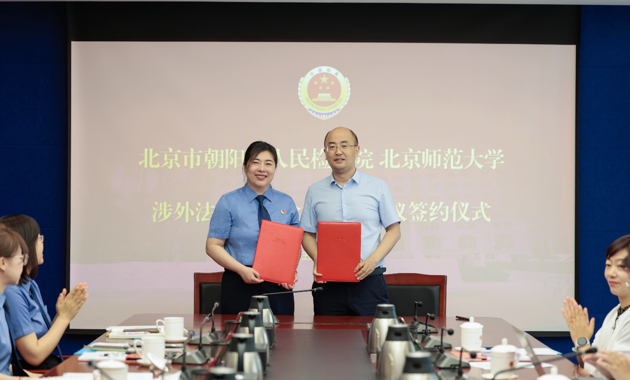 (下圖為朝陽檢察院黨組成員、副檢察長胡靜與北京師范大學(xué)法學(xué)院院長梁迎修簽署涉外法治人才檢校共建協(xié)議)