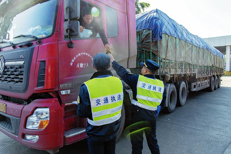 聯(lián)合執(zhí)法人員在高速公路收費站檢查貨運車輛相關證件。