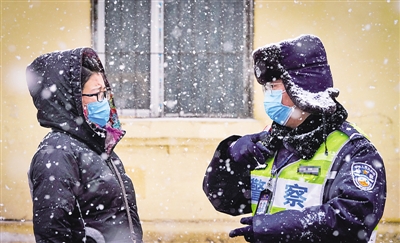 黑龍江哈爾濱市公安局黨員突擊隊隊員、交警支隊機動大隊輔警李可心(右)在為市民講解疫情防控相關規(guī)定。新華社發(fā)