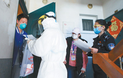 3月21日,江蘇常州鐘樓區(qū)永紅街道花園南村社區(qū)組織社工和民警探訪居家隔離的居民。