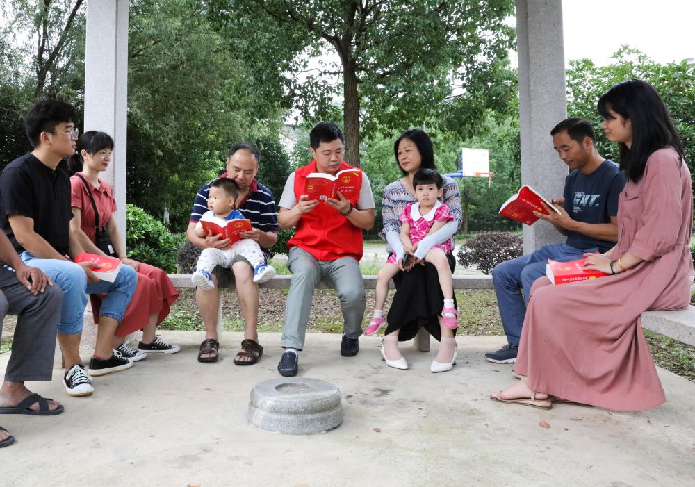 2020年7月4日,在浙江省長興縣小浦鎮(zhèn)中山村的法治長廊里,黨員志愿者為村民宣講民法典。新華社記者 徐昱 攝