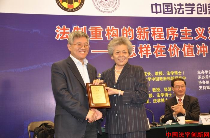 中國法學會黨組書記劉飏常務副會長為俞可平教授頒發(fā)“演講紀念牌”