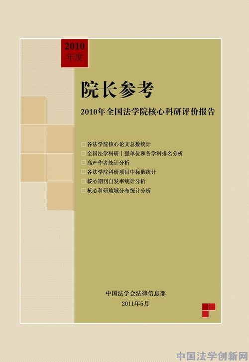 最近,中國法學會法律信息部完成了《2010年全國法學院核心科研評價報告》的編制工作。該報告內(nèi)容分為“2010年各法學院核心論文總數(shù)統(tǒng)計”、“2010年全國法學科研十強單位和各學科排名分析”、“2010年高產(chǎn)作者統(tǒng)計分析”、“2010年各法學院科研項目中標數(shù)統(tǒng)計”、“2010年核心期刊自發(fā)率統(tǒng)計分析”、“2010年核心科研地域分布統(tǒng)計分析”等6篇,16開本,共170頁。近日,該部將向中央各有關(guān)部門、全國法學院校和知名法學家寄送。