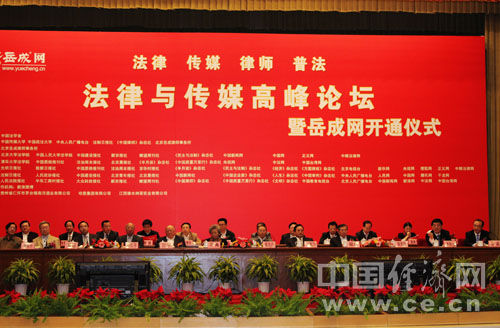 全國政協(xié)經(jīng)濟委員會主任張左己、中國法學(xué)會常務(wù)副會長劉飏、中國傳媒大學(xué)黨委書記李培元、中國政法大學(xué)校長黃進、法制日報社社長賈京平、北京岳成律師事務(wù)所創(chuàng)始人岳成等領(lǐng)導(dǎo)出席論壇并致辭。岳成網(wǎng)啟動儀式上,與會領(lǐng)導(dǎo)和演講嘉賓共同啟動光球,開通了岳成網(wǎng)。