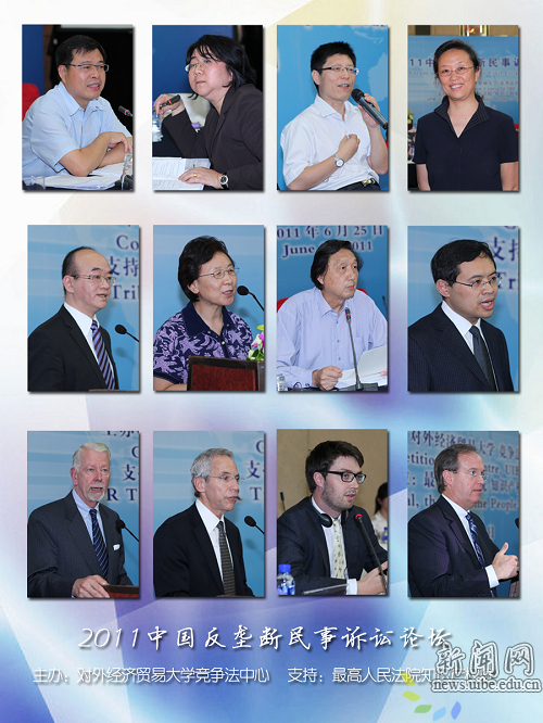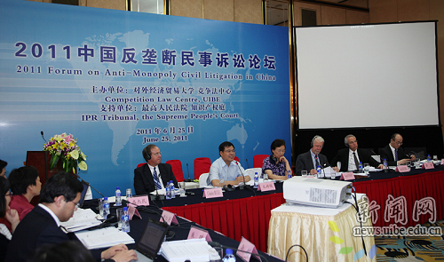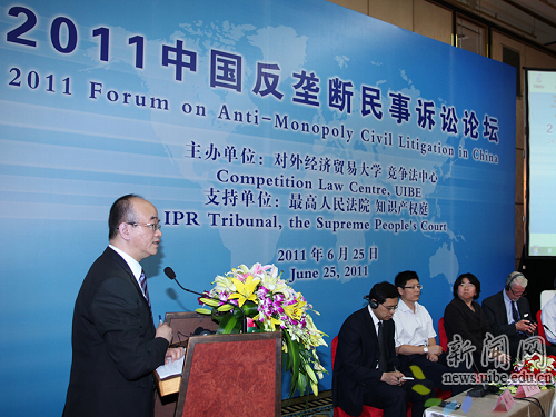 2011年6月25日,由對(duì)外經(jīng)濟(jì)貿(mào)易大學(xué)競(jìng)爭(zhēng)法中心主辦、最高人民法院知識(shí)產(chǎn)權(quán)庭為支持單位的 “2011中國(guó)反壟斷民事訴訟論壇”在北京成功舉行。最高人民法院知識(shí)產(chǎn)權(quán)審判庭孔祥俊庭長(zhǎng)、全國(guó)人大法工委經(jīng)濟(jì)法室袁杰副主任、國(guó)家發(fā)展改革委價(jià)檢司李青副司長(zhǎng)、國(guó)家工商總局競(jìng)爭(zhēng)執(zhí)法局姜天波副局長(zhǎng)、美國(guó)北加利福尼亞聯(lián)邦法院的首席法官沃恩·沃克先生、美國(guó)司法部前副部長(zhǎng)查爾斯·羅爾先生、美國(guó)高通公司全球執(zhí)行副總裁兼首席法律顧問唐納德·羅森伯格先生等出席了論壇。來自最高人民法院和北京、上海、山東、江蘇等地省高中級(jí)人民法院的20余名法官,以及全國(guó)人大法工委、國(guó)務(wù)院法制辦、國(guó)家發(fā)展改革委、商務(wù)部、國(guó)家工商總局、北京大學(xué)、清華大學(xué)、對(duì)外經(jīng)濟(jì)貿(mào)易大學(xué)、中國(guó)社科院等機(jī)構(gòu)負(fù)責(zé)人、中外專家學(xué)者,國(guó)內(nèi)外各大公司、律師事務(wù)所代表共計(jì)130余人參加了本次會(huì)議。