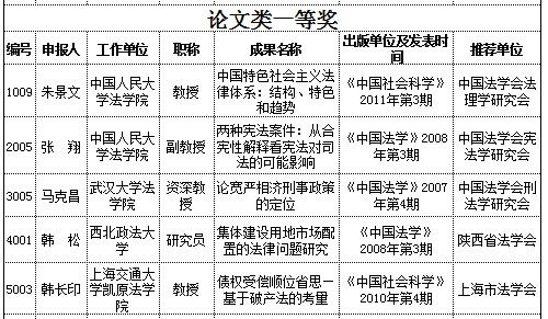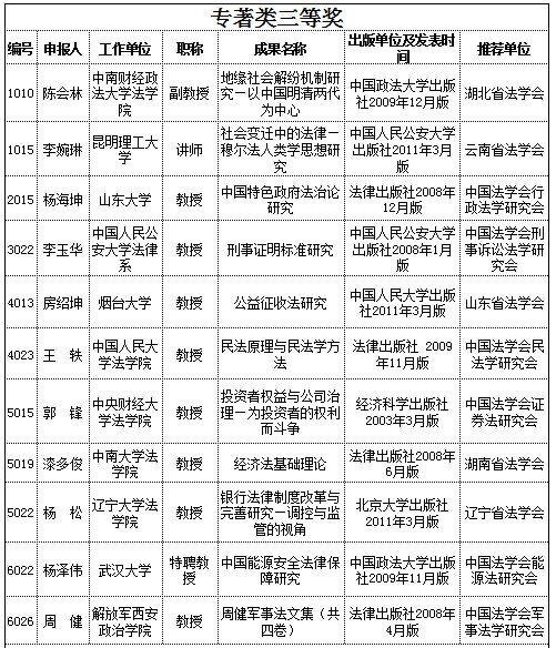 為總結(jié)我國近年來法治建設(shè)取得的成就,促進(jìn)理論法學(xué)、應(yīng)用法學(xué)及相關(guān)交叉學(xué)科等方面的優(yōu)秀法學(xué)研究成果脫穎而出,為全面貫徹落實(shí)依法治國基本方略、加快建設(shè)社會(huì)主義法治國家提供法學(xué)理論支持,中國法學(xué)會(huì)啟動(dòng)了第二屆“中國法學(xué)優(yōu)秀成果獎(jiǎng)”評(píng)選工作。根據(jù)《第二屆中國法學(xué)優(yōu)秀成果獎(jiǎng)評(píng)選辦法》,各省、自治區(qū)、直轄市法學(xué)會(huì),新疆生產(chǎn)建設(shè)兵團(tuán)法學(xué)會(huì),中國法學(xué)會(huì)所屬各學(xué)科、專業(yè)、專門研究會(huì)組織了初評(píng)并將初評(píng)成果向中國法學(xué)會(huì)推薦。在此基礎(chǔ)上,根據(jù)各。▍^(qū)、市)法學(xué)會(huì)和中國法學(xué)會(huì)所屬各學(xué)科(專業(yè)、專門)研究會(huì)推薦的評(píng)選委員候選人建議名單,隨機(jī)從中抽取了84位評(píng)委參與終評(píng)評(píng)選工作(含通訊評(píng)選和集中評(píng)選),以下57部(篇)參評(píng)成果分獲相應(yīng)獎(jiǎng)項(xiàng)。現(xiàn)將獲獎(jiǎng)建議名單公示如下:
