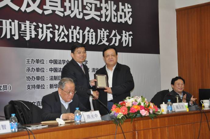 王振民院長(zhǎng)為陳光中教授頒發(fā)演講紀(jì)念牌