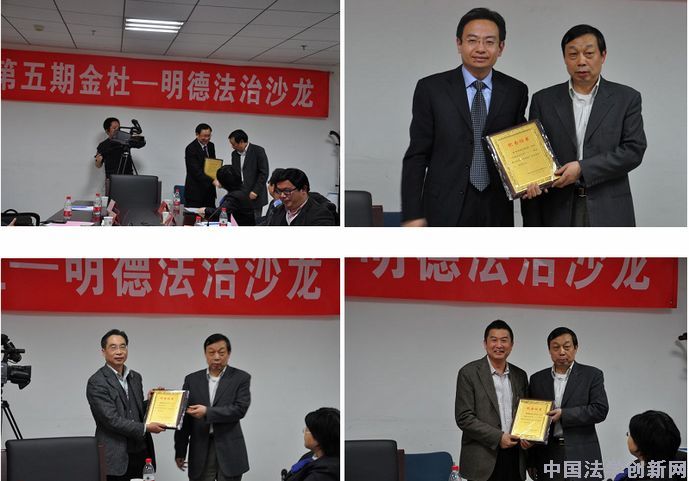 下午5:00,本期沙龍接近尾聲。在掌聲中,主持人胡錦光副院長代表主辦單位和承辦單位向張新寶總編等報(bào)告人頒發(fā)了金杜明德法治沙龍紀(jì)念牌。