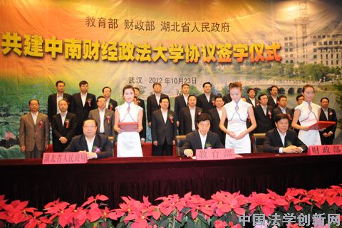 新聞網(wǎng)訊(記者 馬迪思) 10月23日,教育部、財(cái)政部、湖北省人民政府共建中南財(cái)經(jīng)政法大學(xué)協(xié)議簽約儀式在我校文泉報(bào)告廳隆重舉行。教育部副部長(zhǎng)杜玉波、財(cái)政部副部長(zhǎng)王軍、湖北省人民政府常務(wù)副省長(zhǎng)王曉東代表三方簽署協(xié)議并發(fā)表了講話。湖北省委副書記、省長(zhǎng)王國(guó)生,財(cái)政部黨組成員、部長(zhǎng)助理余蔚平出席。湖北省副省長(zhǎng)郭生練主持簽約儀式。