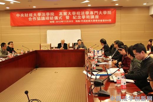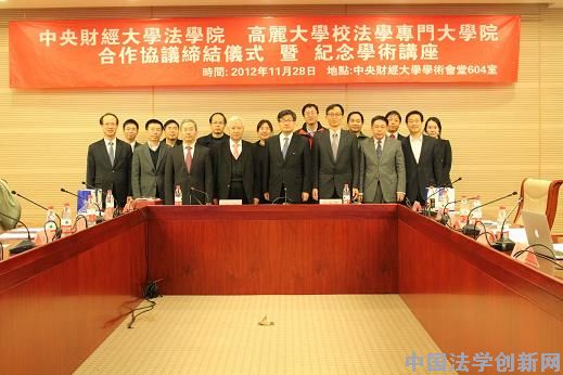 11月28日,中央財經(jīng)大學(xué)法學(xué)院與韓國高麗大學(xué)法學(xué)院學(xué)術(shù)交流與合作協(xié)議簽約儀式在中央財經(jīng)大學(xué)法學(xué)院學(xué)術(shù)會堂604會議室隆重舉行。郭鋒院長和高麗大學(xué)法學(xué)院樸魯馨院長分別代表雙方在協(xié)議上簽字。韓國駐華大使館知識產(chǎn)權(quán)參贊徐東旭博士出席了簽字儀式。