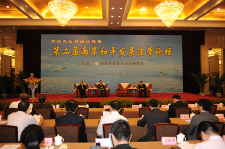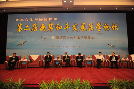 2013年8月14日上午,第二屆兩岸和平發(fā)展法學(xué)論壇在北京會議中心隆重開幕。論壇的主題為“兩岸交往與法治保障”。來自兩岸法學(xué)界、法律界專家學(xué)者共180余人出席論壇。中國法學(xué)會常務(wù)副會長劉飏、海峽兩岸法學(xué)交流協(xié)會理事長廖正豪、中央臺辦、國臺辦副主任孫亞夫先后在開幕式上致辭。論壇由海峽兩岸關(guān)系法學(xué)研究會(簡稱海研會)主辦,海研會會長張福森主持了開幕式。