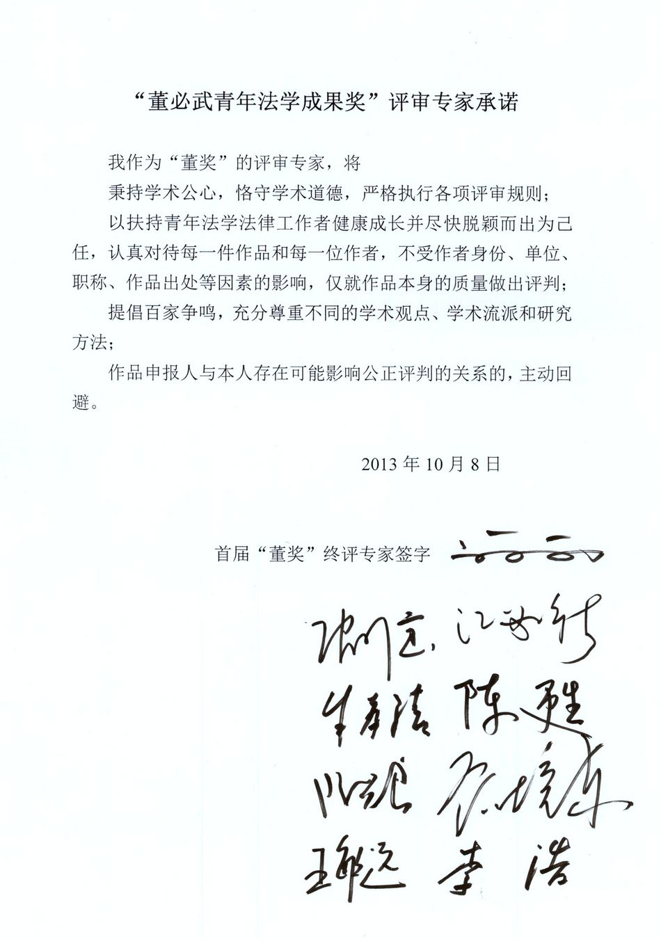 與初評(píng)、復(fù)評(píng)一樣,為保證評(píng)審工作的公正性與嚴(yán)肅性,終評(píng)辦法要求評(píng)審專家簽署評(píng)審承諾書,保證公平地對(duì)待每一件參評(píng)作品和每一位作者。法律信息部副主任呂興煥同志宣讀了專家承諾書,全體評(píng)審專家均表示認(rèn)同并在承諾書上逐一簽下自己的名字。