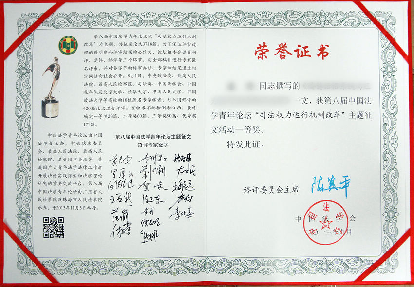 中國法學(xué)創(chuàng)新網(wǎng)訊 11月11日,隨著第八屆中國法學(xué)青年論壇的成功舉辦,獲獎證書的寄送工作也緊張有序進(jìn)行。為了讓大家大飽眼福,特將青年論壇獲獎證書精美樣張附送。證書全國包郵,記得給好評哦親!