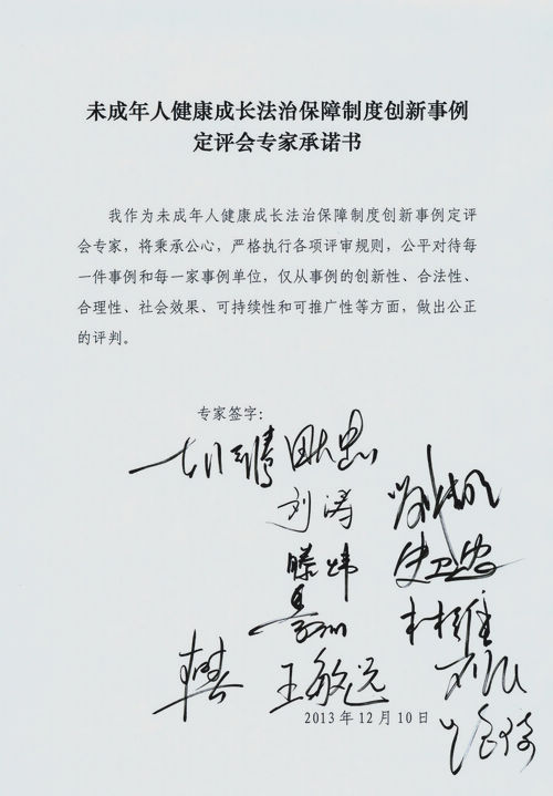隨后,法律信息部呂興煥副主任和王偉國副主任分別宣讀了《未成年人健康成長法治保障制度創(chuàng)新事例定評辦法(草案)》和專家承諾書,全體評審專家一致通過了定評辦法,并在承諾書上簽名。中央綜治辦田大忠巡視員介紹了專家分組名單和定評細(xì)則后,會議進(jìn)入到評審環(huán)節(jié)。