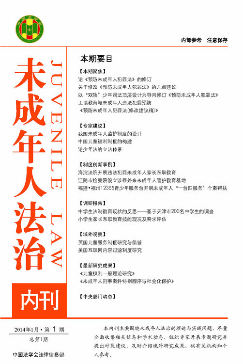 《未成年人法治內(nèi)刊》力求充分發(fā)揮中國法學會的職能和優(yōu)勢,及時、全面收集未成年人法治領域的最新信息及相關研究成果,為中央領導和有關部門提供決策參考。內(nèi)刊設編委會,主任為中國法學會黨組書記、常務副會長陳冀平同志,副主任為中國法學會黨組成員、副會長、學術委員會主任張文顯同志,委員由未成年人法治理論與實務部門的24位著名專家學者組成。主編由中國法學會法律信息部主任李仕春教授擔任,執(zhí)行主編為曹菲副研究員,副主編為劉燦華助理研究員。