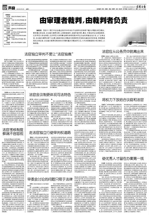 黨的十八屆三中全會(huì)通過(guò)的《中共中央關(guān)于全面深化改革若干重大問(wèn)題的決定》提出,要完善主審法官、合議庭辦案責(zé)任制,讓審理者裁判、由裁判者負(fù)責(zé)。最近,中國(guó)法學(xué)會(huì)法律信息部、北京師范大學(xué)法學(xué)院、北京師范大學(xué)刑事法律科學(xué)研究院共同主辦金杜明德法治沙龍,以“主審法官、合議庭辦案責(zé)任制”為主題,邀請(qǐng)對(duì)相關(guān)問(wèn)題進(jìn)行持續(xù)研究并有相關(guān)著述的專家學(xué)者,緊緊圍繞落實(shí)主審法官、合議庭辦案責(zé)任制的熱點(diǎn)問(wèn)題和重點(diǎn)問(wèn)題各抒己見(jiàn)。今天本版摘登部分觀點(diǎn)意見(jiàn),以饗讀者。