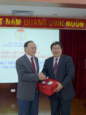 阮文權(quán)副會長向調(diào)研組贈送禮物;李仕春主任向越南法學(xué)家協(xié)會贈送禮物