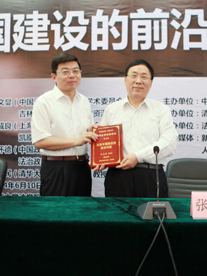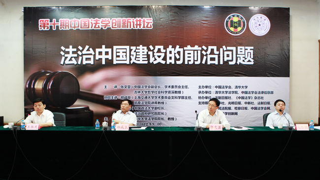 6月10日上午,由中國法學(xué)會和清華大學(xué)共同主辦、中國法學(xué)會法律信息部和清華大學(xué)法學(xué)院共同承辦、法制日報社和《中國法學(xué)》雜志社協(xié)辦的第10期中國法學(xué)創(chuàng)新講壇在清華大學(xué)隆重舉行。本期講壇的主題為“法治中國建設(shè)的前沿問題”,由中國法學(xué)會副會長、學(xué)術(shù)委員會主任張文顯教授主講,上海交通大學(xué)學(xué)術(shù)委員會文科學(xué)部主任鄭成良教授、中國政法大學(xué)副校長馬懷德教授協(xié)同主講,清華大學(xué)法學(xué)院院長王振民教授主持。各大高校的師生近200名濟濟一堂,參加了講壇。講壇歷時3個多小時,3位教授就法治中國建設(shè)的指導(dǎo)思想、戰(zhàn)略目標(biāo)、重大任務(wù)、面臨的挑戰(zhàn)、改革的關(guān)鍵等重大理論與實踐問題發(fā)表了精彩的見解,并與在場聽眾展開了深入的交流。講壇取得圓滿成功。