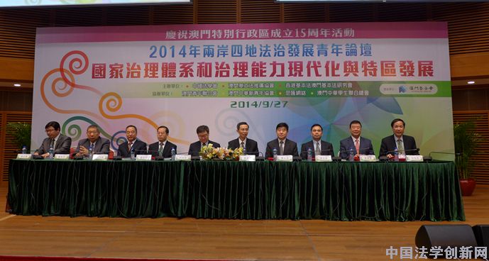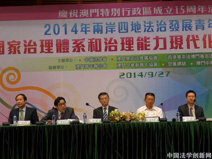 中國法學(xué)創(chuàng)新網(wǎng)訊:9月27日,由中國法學(xué)會(huì)、澳門基本法推廣協(xié)會(huì)、香港基本法澳門基本法研究會(huì)共同主辦的2014年兩岸四地法治發(fā)展青年論壇在澳門隆重舉行。中國法學(xué)會(huì)副會(huì)長、全國政協(xié)常委、社會(huì)和法制委員會(huì)副主任、原最高人民檢察院副檢察長朱孝清,全國人大常委會(huì)港澳基本法委員會(huì)研究室主任劉淑強(qiáng),中央人民政府駐澳門特別行政區(qū)聯(lián)絡(luò)辦公室研究室主任陳永浩,國務(wù)院港澳事務(wù)辦公室法律司副司長奚俊堅(jiān),中央人民政府駐香港特別行政區(qū)聯(lián)絡(luò)辦公室法律部副部長李光祥,澳門特別行政區(qū)行政法務(wù)司陳麗敏司長代表、顧問趙向陽,澳門基本法推廣協(xié)會(huì)會(huì)長廖澤云,澳門基本法推廣協(xié)會(huì)理事長崔世昌,香港基本法澳門基本法研究會(huì)秘書長、清華大學(xué)法學(xué)院教授林來梵等出席論壇。開幕式由中國法學(xué)會(huì)研究部主任、中國法學(xué)會(huì)一國兩制和基本法研究中心主任李仕春教授主持。