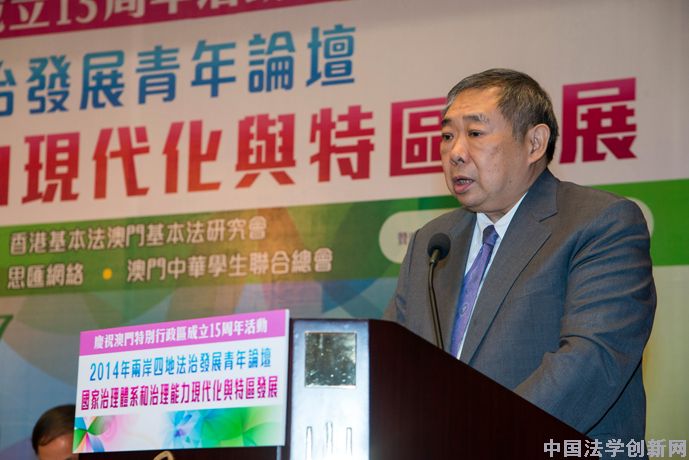 朱孝清指出,“一國兩制”是我國國家治理體系的重要內(nèi)容,“一國兩制”的全面貫徹落實(shí)和不斷豐富發(fā)展,是國家治理現(xiàn)代化的應(yīng)有之義。香港、澳門回歸祖國后,中央和特區(qū)政府嚴(yán)格按照憲法和基本法辦事,堅(jiān)定不移地貫徹“一國兩制”方針,妥善處理了涉及港澳的一系列重大問題,豐富了“一國兩制”的理論和實(shí)踐。回歸15年來,澳門特別行政區(qū)充分發(fā)揮法治在特別行政區(qū)治理中的重要作用,既全面貫徹落實(shí)澳門基本法,又根據(jù)澳門實(shí)際,制定了200余部法律,很好地處理了“基本不變”與發(fā)展創(chuàng)新之間的關(guān)系,努力探索符合澳門實(shí)際情況的發(fā)展道路,積累了許多成功的治理經(jīng)驗(yàn),豐富了我國治理體系和治理能力的現(xiàn)代化的內(nèi)涵。本次論壇旨在總結(jié)特區(qū)發(fā)展及基本法實(shí)施的成功經(jīng)驗(yàn),為兩岸四地青年法學(xué)法律工作者展示才華、貢獻(xiàn)智慧、交流提升、增進(jìn)友誼搭建平臺(tái),不斷增強(qiáng)國家認(rèn)同,共同為國家的法治進(jìn)步作出貢獻(xiàn)。