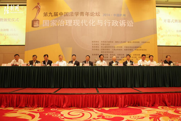 10月10日,為迎接黨的十八屆四中全會勝利召開,為其增添濃厚的學(xué)術(shù)氛圍和輿論氛圍,以“國家治理現(xiàn)代化與行政訴訟” 為主題的第九屆中國法學(xué)青年論壇在浙江省杭州市隆重舉行。論壇由中央政法委員會、最高人民法院、最高人民檢察院、共青團(tuán)中央指導(dǎo),中國法學(xué)會主辦,浙江省杭州市中級人民法院和中國法學(xué)會法律信息部承辦,《法制日報》、《人民法院報》、《檢察日報》、《中國法學(xué)》、《清華法學(xué)》協(xié)辦。中國法學(xué)會黨組成員、副會長、學(xué)術(shù)委員會主任張文顯,中共浙江省委副書記、省委政法委書記、省法學(xué)會會長王輝忠,最高人民檢察院副檢察長、二級大檢察官李如林,中國法學(xué)會董必武法學(xué)思想研究會副會長、原國務(wù)院法制局局長孫琬鐘,浙江省高級人民法院院長、二級大法官齊奇,浙江省杭州市委副書記、市委政法委書記楊戌標(biāo)等出席論壇。最高人民法院行政審判庭庭長趙大光代表最高人民法院黨組副書記、副院長江必新出席論壇。論壇開幕式由杭州市中級人民法院院長翁鋼糧主持。