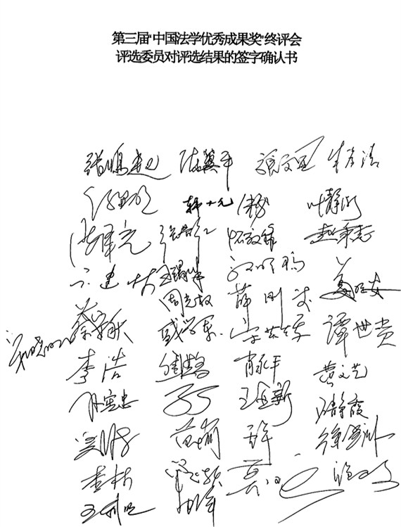 隨后,會(huì)議馬上進(jìn)入全體評(píng)委集中投票階段。在張文顯副會(huì)長的主持下,全體評(píng)委依次進(jìn)行了論文類一、二、三等獎(jiǎng),專著類一、二、三等獎(jiǎng)的投票。在進(jìn)行論文類、專著類一、二等獎(jiǎng)作品投票之前,均由6個(gè)學(xué)科組的召集人宣讀了每一件候選作品的推薦理由。經(jīng)過6個(gè)輪次的評(píng)選,全體評(píng)委通過無記名投票,產(chǎn)生了專著類一等獎(jiǎng)2部、二等獎(jiǎng)8部、三等獎(jiǎng)15部;論文類一等獎(jiǎng)5篇、二等獎(jiǎng)10篇、三等獎(jiǎng)15篇,并現(xiàn)場宣布投票結(jié)果。全體評(píng)委在評(píng)審結(jié)果上簽字確認(rèn)。其中,在投票產(chǎn)生一等獎(jiǎng)?wù)撐臅r(shí),出現(xiàn)了第三名有3件作品票數(shù)相同的情形。按照《第三屆“中國法學(xué)優(yōu)秀成果獎(jiǎng)”評(píng)選辦法》的規(guī)定,論文類一等獎(jiǎng)的數(shù)額應(yīng)當(dāng)為3篇。但按照《第三屆“中國法學(xué)優(yōu)秀成果獎(jiǎng)”終評(píng)工作細(xì)則》的規(guī)定,“各等級(jí)獎(jiǎng)項(xiàng)最后一個(gè)名額如果出現(xiàn)并列,并列的成果均獲該等級(jí)獎(jiǎng)項(xiàng),不再重復(fù)投票”。經(jīng)過全體評(píng)委討論決定,上述3件票數(shù)相同的作品連同排名第一、二名的作品均獲得論文類一等獎(jiǎng)。