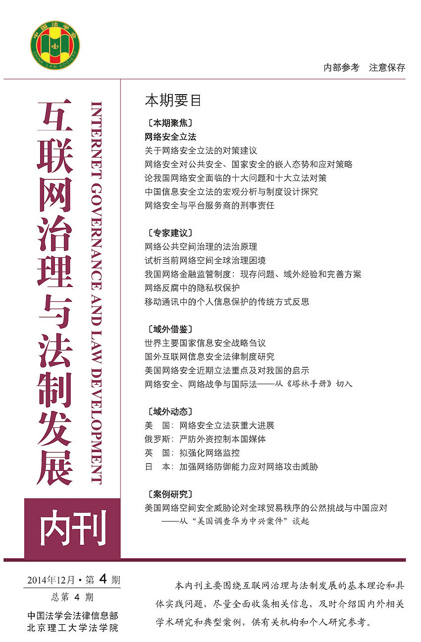 2014年12月,《互聯(lián)網(wǎng)治理與法制發(fā)展內(nèi)刊》2014年第4期順利出刊,近期已寄送相關(guān)單位。本期內(nèi)刊聚焦“網(wǎng)絡(luò)安全立法”。為了對(duì)網(wǎng)絡(luò)安全保障工作提供有益的啟示和借鑒,我們選編了最近一段時(shí)間來關(guān)于網(wǎng)絡(luò)安全立法的理論研究與實(shí)踐探索資料,進(jìn)一步推進(jìn)網(wǎng)絡(luò)安全監(jiān)管的法治化,為中央有關(guān)決策部門提供信息和理論支持。