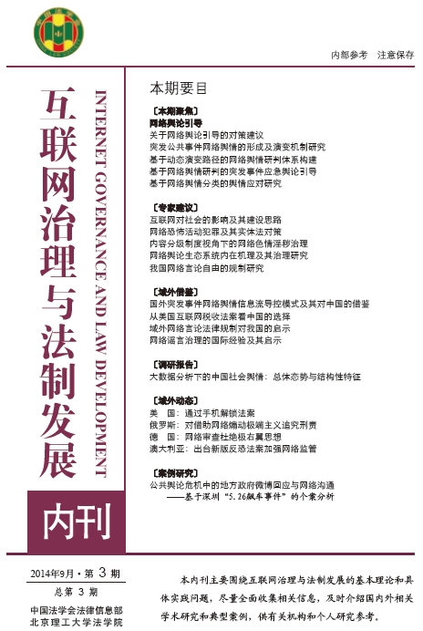 日前,《互聯(lián)網(wǎng)治理與法制發(fā)展內(nèi)刊》2014年第3期順利出刊并寄送相關(guān)單位。本期內(nèi)刊聚焦“網(wǎng)絡(luò)輿論引導(dǎo)”,選編了最近一段時間來的理論研究與實踐探索,為了對落實網(wǎng)絡(luò)輿論引導(dǎo)工作提供有益的啟示和借鑒,為中央有關(guān)決策部門提供信息和理論支持!痘ヂ(lián)網(wǎng)治理與法制發(fā)展內(nèi)刊》是中國法學會法律信息部五種內(nèi)刊系列之一,力求充分發(fā)揮中國法學會的職能和優(yōu)勢,及時、全面匯聚互聯(lián)網(wǎng)法治動態(tài)及相關(guān)研究成果,為相關(guān)部門的互聯(lián)網(wǎng)法治改革提供決策參考。