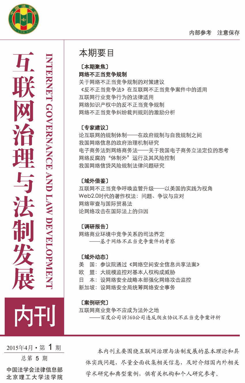 2015年4月,《互聯(lián)網(wǎng)治理與法制發(fā)展內(nèi)刊》總第5期順利出刊,近期已寄送相關(guān)單位。本期內(nèi)刊聚焦“網(wǎng)絡(luò)不正當競爭規(guī)制”。為了對網(wǎng)絡(luò)不正當競爭規(guī)制工作提供有益的啟示和借鑒,我們選編了最近一段時間來關(guān)于網(wǎng)絡(luò)不正當競爭規(guī)制的理論研究與實踐探索資料,為中央有關(guān)決策部門提供信息和理論支持。