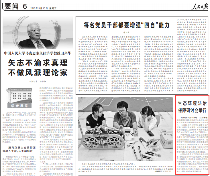 本報北京5月14日電 。ㄓ浾邚堣┯森h(huán)境保護部和中國法學(xué)會共同主辦的生態(tài)環(huán)境法治保障研討會14日在京召開。十二屆全國人大常委會副委員長嚴(yán)雋琪出席研討會并講話。來自環(huán)境保護相關(guān)職能部門、法律實務(wù)界和法學(xué)理論界的專家學(xué)者近150人參加了研討會。