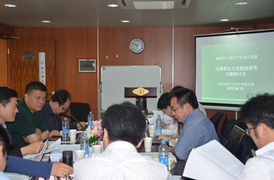 4月28日上午,劉風(fēng)景教授主持的中國法學(xué)會(huì)“深入研究黨的十八屆四中全會(huì)精神”重點(diǎn)專項(xiàng)課題“完善授權(quán)立法制度研究”課題啟動(dòng)會(huì),在華東政法大學(xué)科學(xué)研究院召開。中國法學(xué)會(huì)研究部曹菲副調(diào)研員、上海市法學(xué)會(huì)研究部張志軍副主任、華東政法大學(xué)科研處韓強(qiáng)副處長及多位專家學(xué)者參與了本次論證會(huì)。會(huì)議由華東政法大學(xué)科學(xué)研究院院長陳金釗教授主持。曹菲副調(diào)研員代表中國法學(xué)會(huì)肯定了該課題的理論意義與實(shí)踐價(jià)值,對(duì)課題的下一步研究提出了希望和要求,并介紹了課題的相關(guān)成果轉(zhuǎn)化形式。張志軍副主任代表上海市法學(xué)會(huì)對(duì)劉風(fēng)景教授中標(biāo)中國法學(xué)會(huì)重點(diǎn)專項(xiàng)課題表示祝賀,并有針對(duì)性地提出了研究建議。